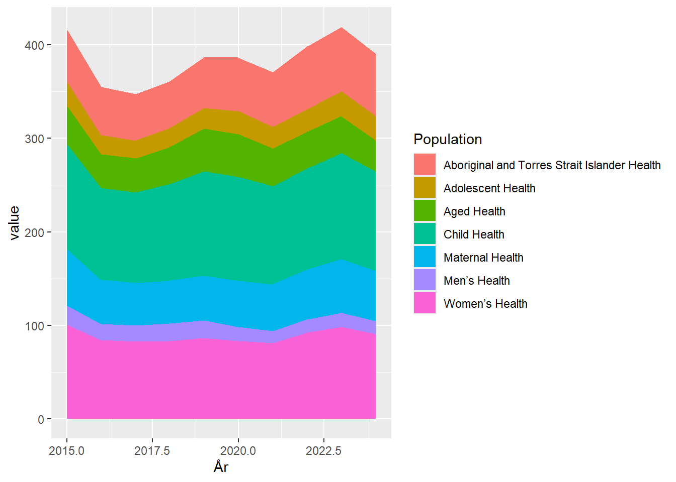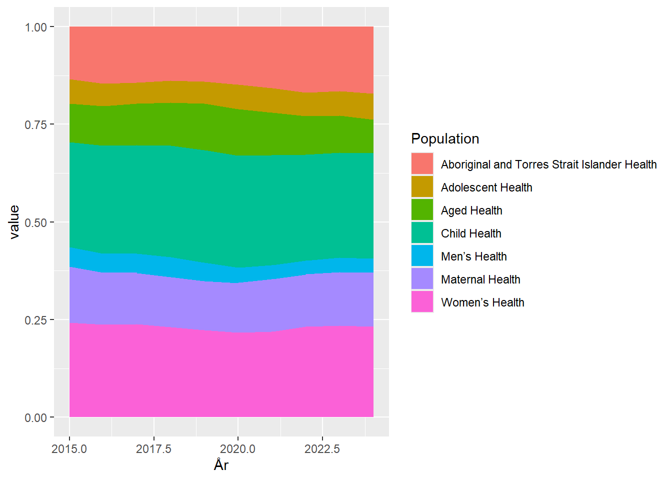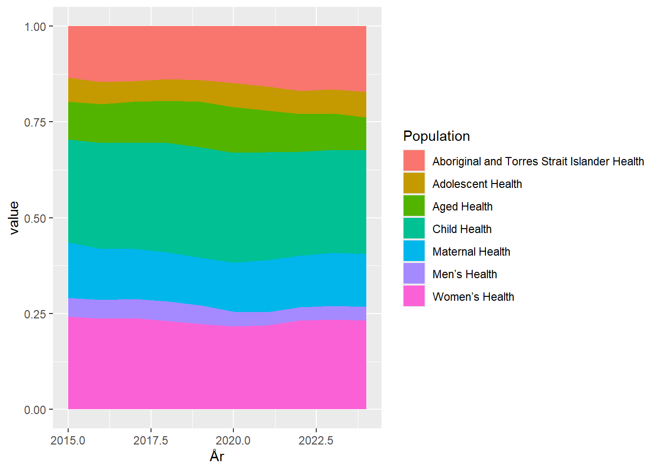Det ændrer ikke på at det er vanskeligt at aflæse på grafen hvor stor en andel der bruges på “Aged Health”, og en tabel vil ofte være at foretrække hvis man faktisk er interesseret i udviklingen. Det er næppe et tilfælde at de oprindelige data netop præsenteres som en tabel.